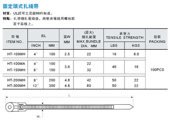 產(chǎn)品材質(zhì):尼龍扎帶采用UL認可尼龍66(Nylon 66)材料注塑制成,防火等級94V-2,具有良好的耐酸、腐蝕、絕緣性,不易老化、承受力強。操作溫度為-20℃到+80℃(普通尼龍66)。